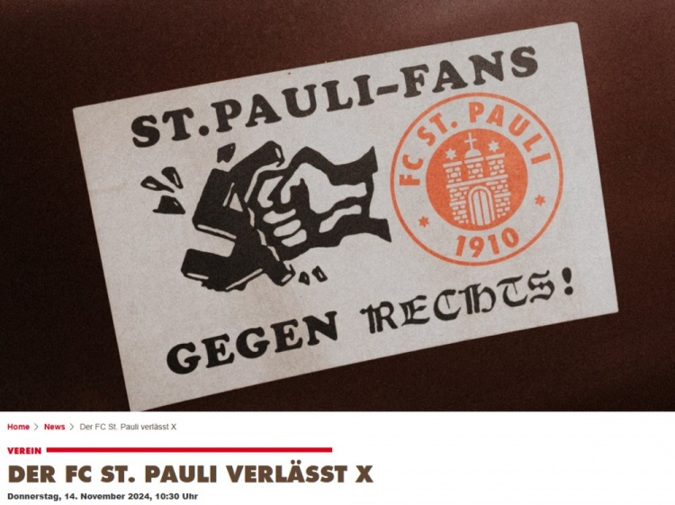 圣保利官方聲明寫道:“圣保利俱樂部將退出社交媒體平臺X,我們迄今在X已擁有25萬個粉絲,俱樂部自2013年以來一直活躍在該平臺上。而我們退出的原因是:X的所有者埃隆-馬斯克已經(jīng)將公共討論空間變成了仇恨放大器,還可能影響德國議會的競選活動。”