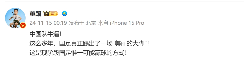 董路在社媒寫道:中國(guó)隊(duì)牛逼!這么多年,國(guó)足真正踢出了一場(chǎng)“美麗的大腳”!這是現(xiàn)階段國(guó)足唯一可能贏球的方式! ???