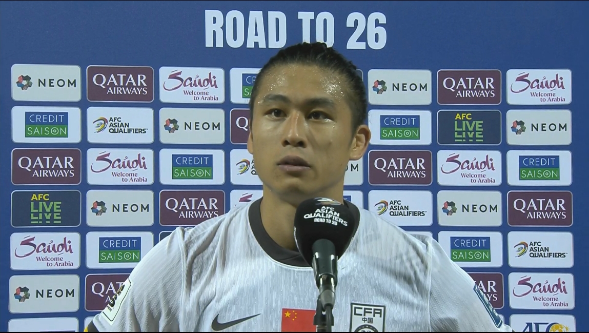 11月15日訊 國足1-0絕殺巴林,賽后張玉寧英語接受場邊采訪。