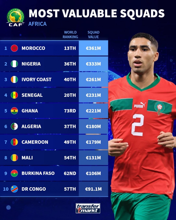 非洲球隊(duì)德轉(zhuǎn)身價(jià)榜(括號(hào)內(nèi)為FIFA世界排名):