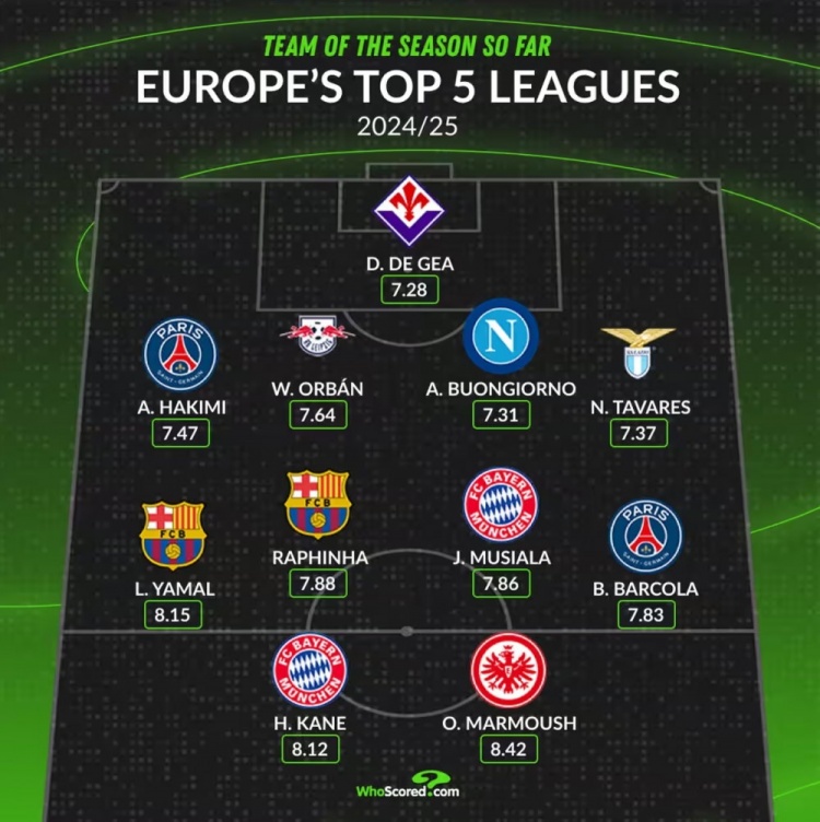 11月17日訊 WhoScored列出了本賽季至今五大聯(lián)賽最佳陣容,凱恩、亞馬爾、拉菲尼亞、穆西亞拉,德赫亞在列。