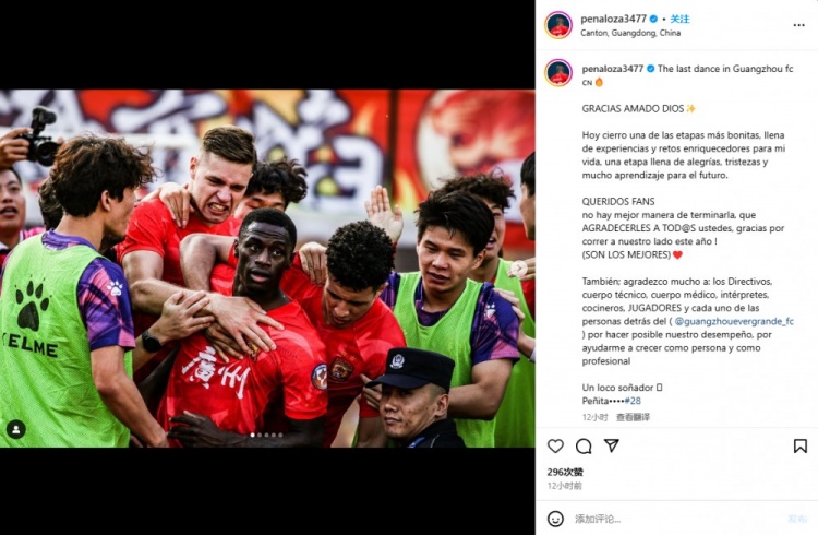 11月18日訊 廣州隊(duì)外援貝尼亞羅薩在社媒發(fā)文,向廣州隊(duì)和廣州球迷告別。