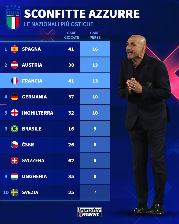 德國轉會市場統(tǒng)計了各隊戰(zhàn)勝意大利的次數(shù),法國13勝并列第二多,僅少于西班牙。