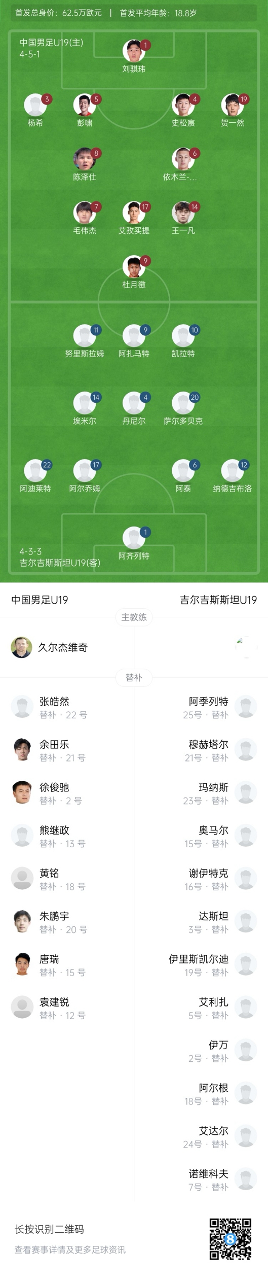 U19國(guó)足首發(fā):1-劉騏瑋、3-楊希、4-史松宸、5-彭嘯、6-依木蘭-買買提、8-陳澤仕、7-毛偉杰、9-杜月徵、14-王一凡、19-賀一然、17-艾孜買提-凱撒爾
