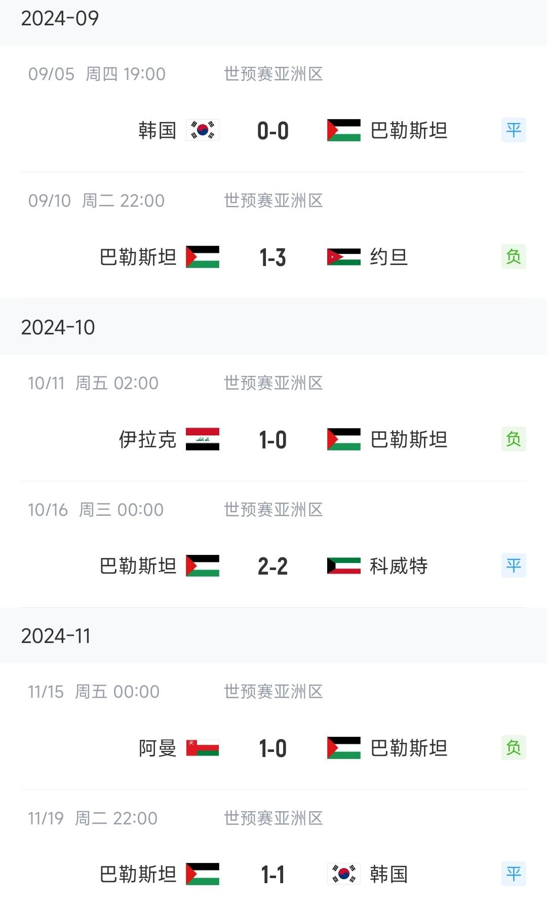 值得一提的是,巴勒斯坦18強賽中取得的3分,有2分是在韓國身上拿到的,首循環(huán)客場對陣韓國的比賽,巴勒斯坦0-0與韓國戰(zhàn)平。
