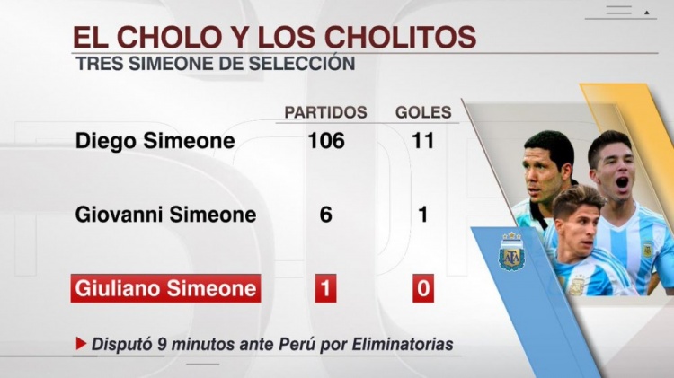 ESPN指出,迭戈-西蒙尼與他的大兒子吉奧瓦尼-西蒙尼、三兒子朱利亞諾-西蒙尼都為阿根廷隊出場過,可謂一門三國腳,西蒙尼二兒子吉安盧卡也是職業(yè)球員,但未入選過阿根廷國家隊。