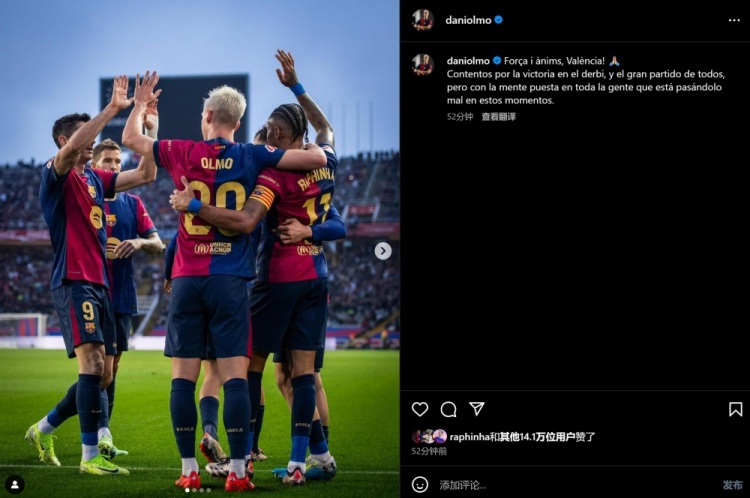 11月4日訊 本輪西甲比賽中,巴薩3-1擊敗西班牙人,奧爾莫上演梅開二度。賽后,他更新了動(dòng)態(tài),慶祝球隊(duì)贏下加泰德比,也對(duì)受到西班牙世紀(jì)洪災(zāi)影響的人表達(dá)了關(guān)心。