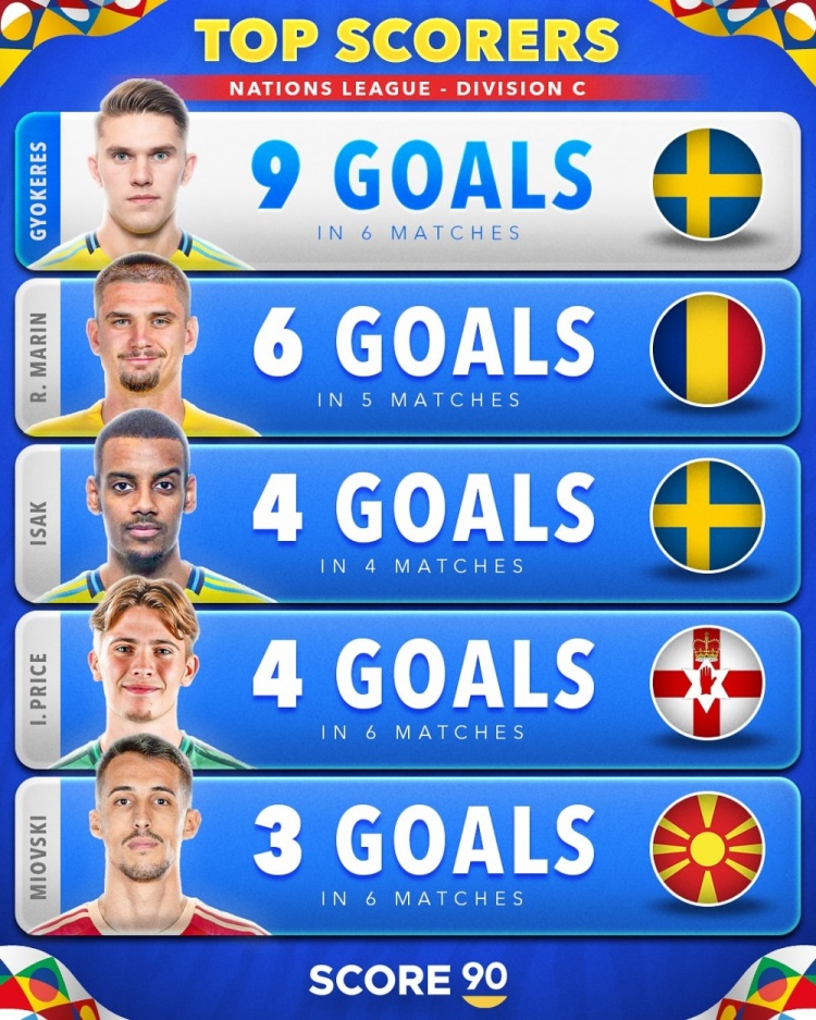 歐國聯(lián)各級聯(lián)賽射手榜: