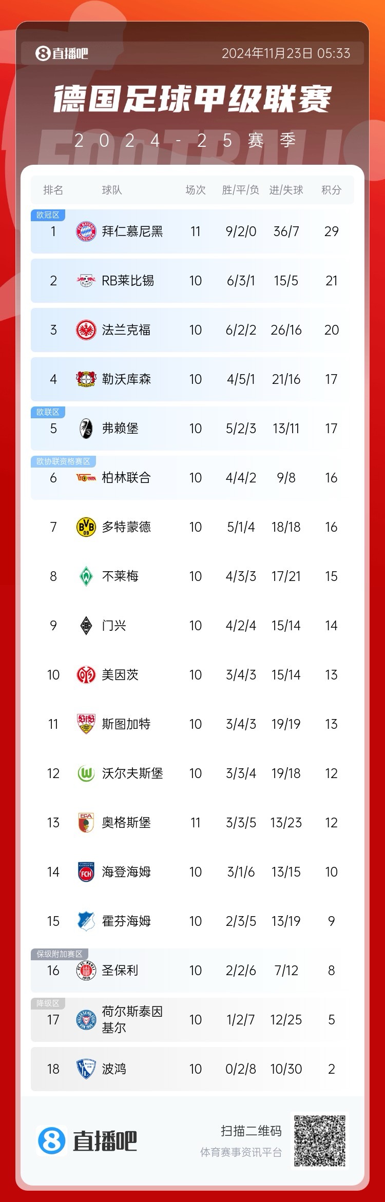 11月23日訊 德甲第11輪,先賽的拜仁3-0完勝奧格斯堡。此役后,拜仁29分領(lǐng)跑,領(lǐng)先本輪未賽的萊比錫8分。