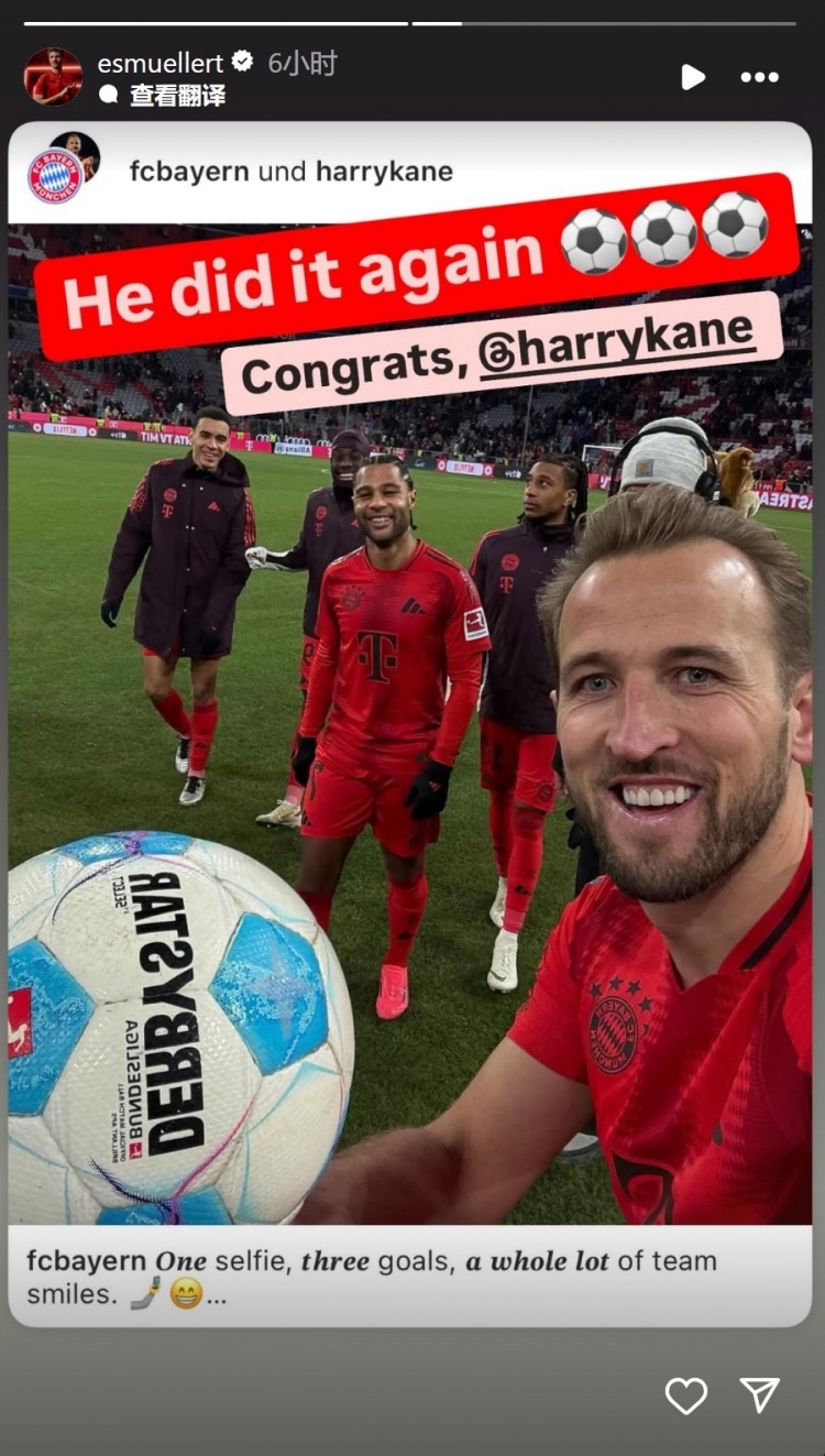 穆勒社媒轉(zhuǎn)發(fā)凱恩手拿比賽用球的照片,并配文:“他又一次做到了,祝賀你,凱恩?!?/p>