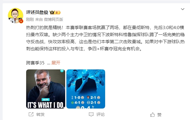 11月24日訊 本輪英超焦點戰(zhàn),曼城0-4不敵熱刺。賽后,評述員詹俊發(fā)文點評。