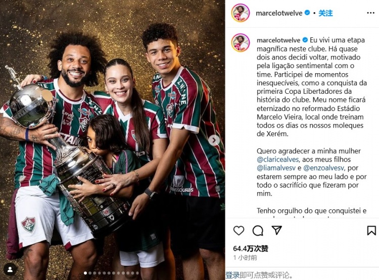 馬塞洛:“我在這個俱樂部過得很愉快,大約兩年前,我決定回歸,因為我和俱樂部之間的情感紐帶。我參與了一些難忘的時刻,比如贏得俱樂部歷史上第一個解放者杯冠軍。我的名字將永垂不朽在整修過的主場內(nèi),這是我們的球員每天都訓(xùn)練的地方。