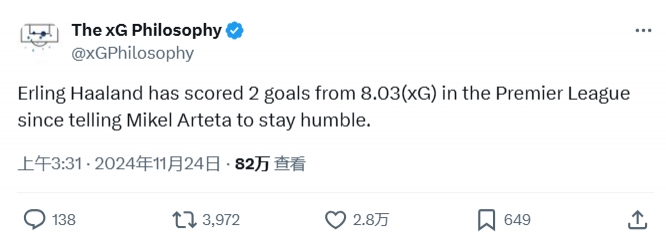 數(shù)據(jù)機構(gòu)寫道:自告知阿爾特塔“保持謙遜”以來,哈蘭德在英超獲得8.02的預(yù)期進球,但僅打進2球。