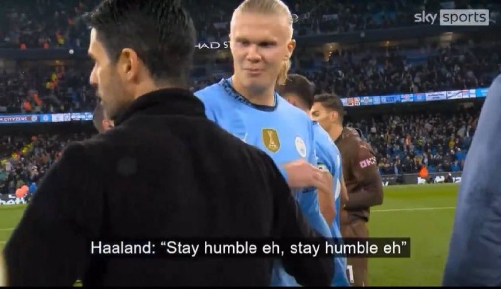 9月份的英超第5輪,曼城主場2-2阿森納,賽后兩隊發(fā)生小沖突,鏡頭捕捉到哈蘭德對阿森納球員及教練喊道:“保持謙遜(stay humble)?!?/p>