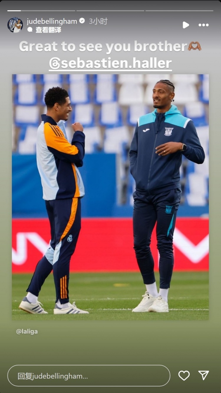 貝林厄姆在多特時期的隊(duì)友阿萊本賽季被外租至萊加內(nèi)斯,此役替補(bǔ)出場。貝林厄姆社媒曬出與阿萊的合照,并配文:“很高興見到你,兄弟。”