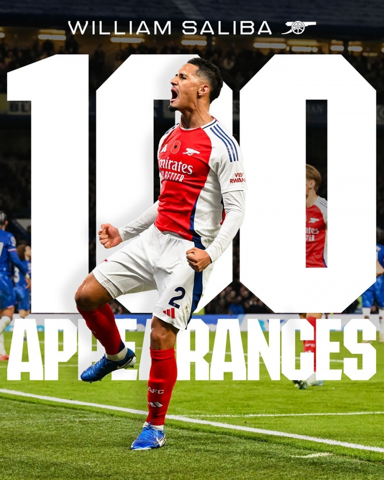 這也將是薩利巴為阿森納出戰(zhàn)的第100場比賽。阿森納制作了海報向這名后防大將送上祝賀。