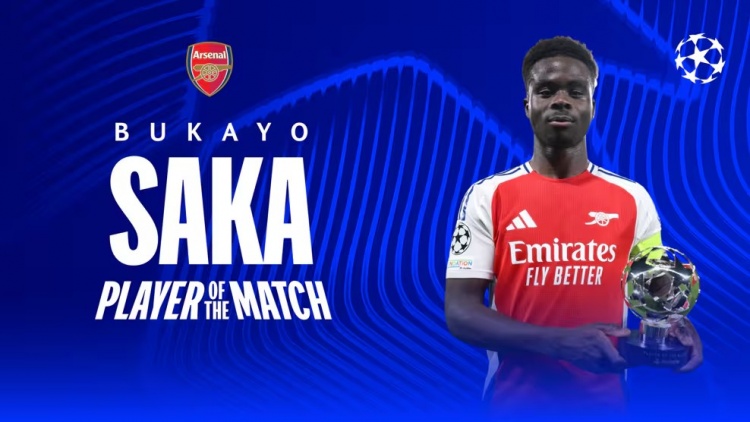11月27日訊 歐冠比賽,阿森納客場5-1戰(zhàn)勝葡體。賽后,歐足聯(lián)官方宣布,薩卡當(dāng)選全場最佳球員。