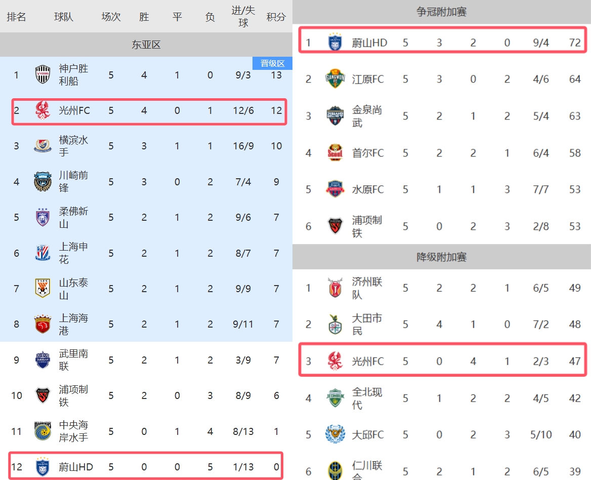 11月27日訊 亞冠精英聯(lián)賽5輪戰(zhàn)罷,K聯(lián)賽領(lǐng)頭羊蔚山HD五戰(zhàn)全敗,丟13球只進1球仍然驚訝,另一支韓國球隊光州FC4勝1負拿到12分高居第二,而他們在K聯(lián)賽則需要通過附加賽來保級,目前排名降級附加賽的第三位。