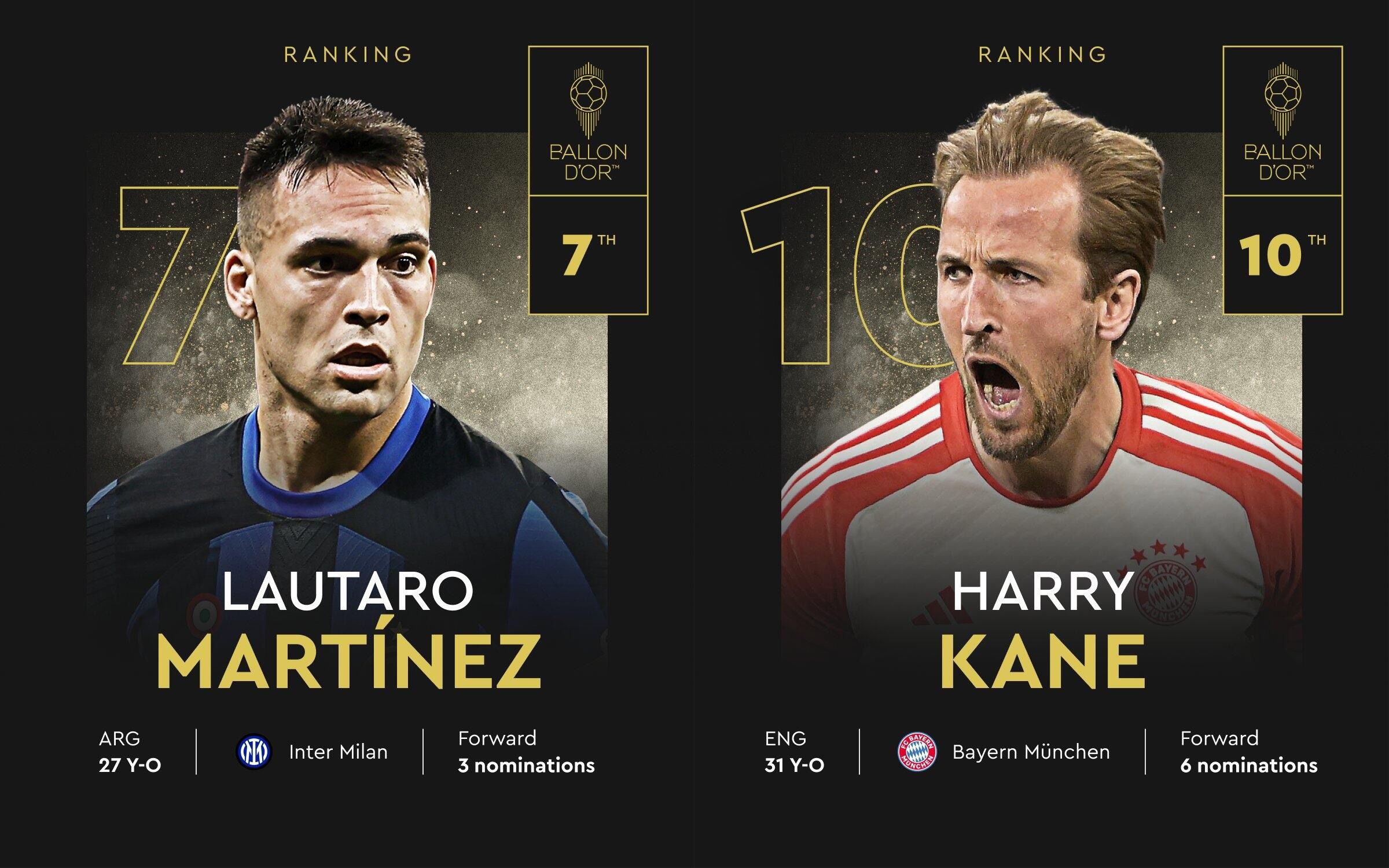 2024金球排名前10的球員中,僅第7勞塔羅和第10凱恩未入選今年世足候選名單。