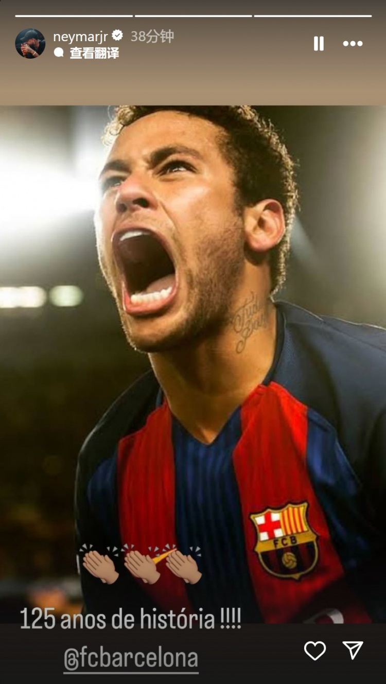 內(nèi)馬爾曬出自己身穿巴薩戰(zhàn)袍的照片,并寫道:125年的歷史??!