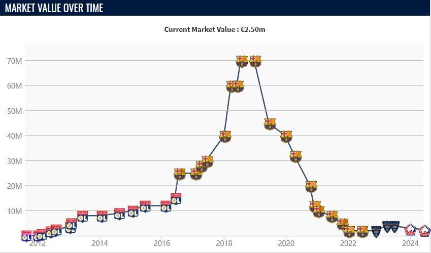 2016年夏窗,巴薩以2500萬歐元的轉(zhuǎn)會費,從里昂簽下烏姆蒂蒂。效力巴薩前兩年,烏姆蒂蒂牢牢占據(jù)球隊主力中衛(wèi)位置,身價最高曾達到7000萬歐。