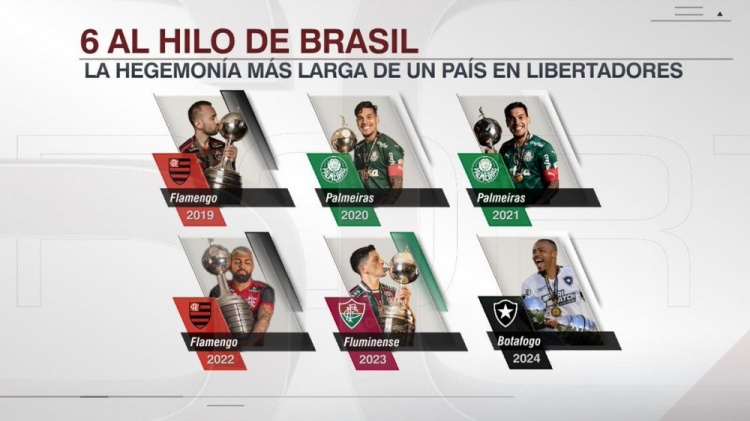 ESPN指出,近6屆解放者杯,巴西球隊(duì)均奪冠,其中4屆決賽是巴西球隊(duì)內(nèi)戰(zhàn),上一支問(wèn)鼎解放者杯的非巴西球隊(duì)是2018年的河床。