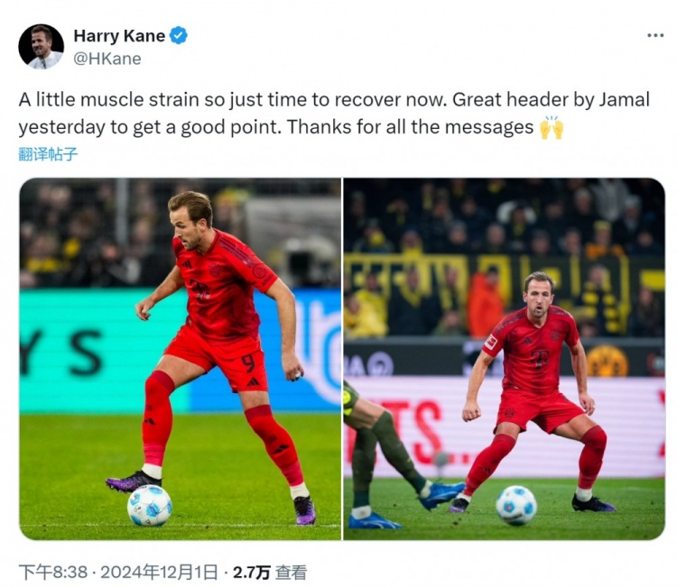 凱恩在社交媒體上曬出比賽照片,并寫道:“肌肉有點拉傷,現(xiàn)在是時候好好恢復了。”