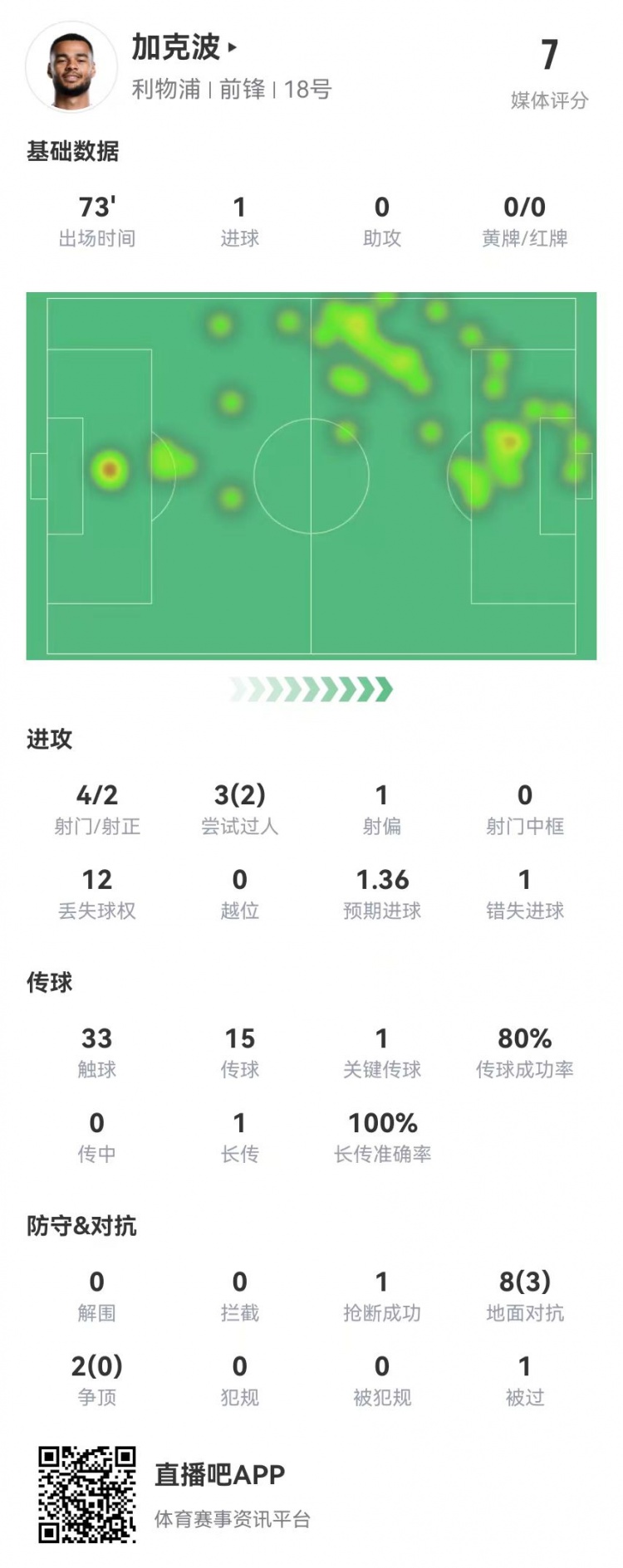 12月2日訊 利物浦在本輪英超主場(chǎng)迎戰(zhàn)曼城,加克波本場(chǎng)數(shù)據(jù)如下: