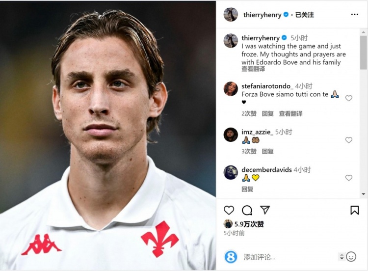 法國足壇名宿亨利在社交媒體上曬出博維的照片,并寫道:“我當時正在看比賽,一下子就愣住了。我為博維和他的家人祈禱?!?/p>