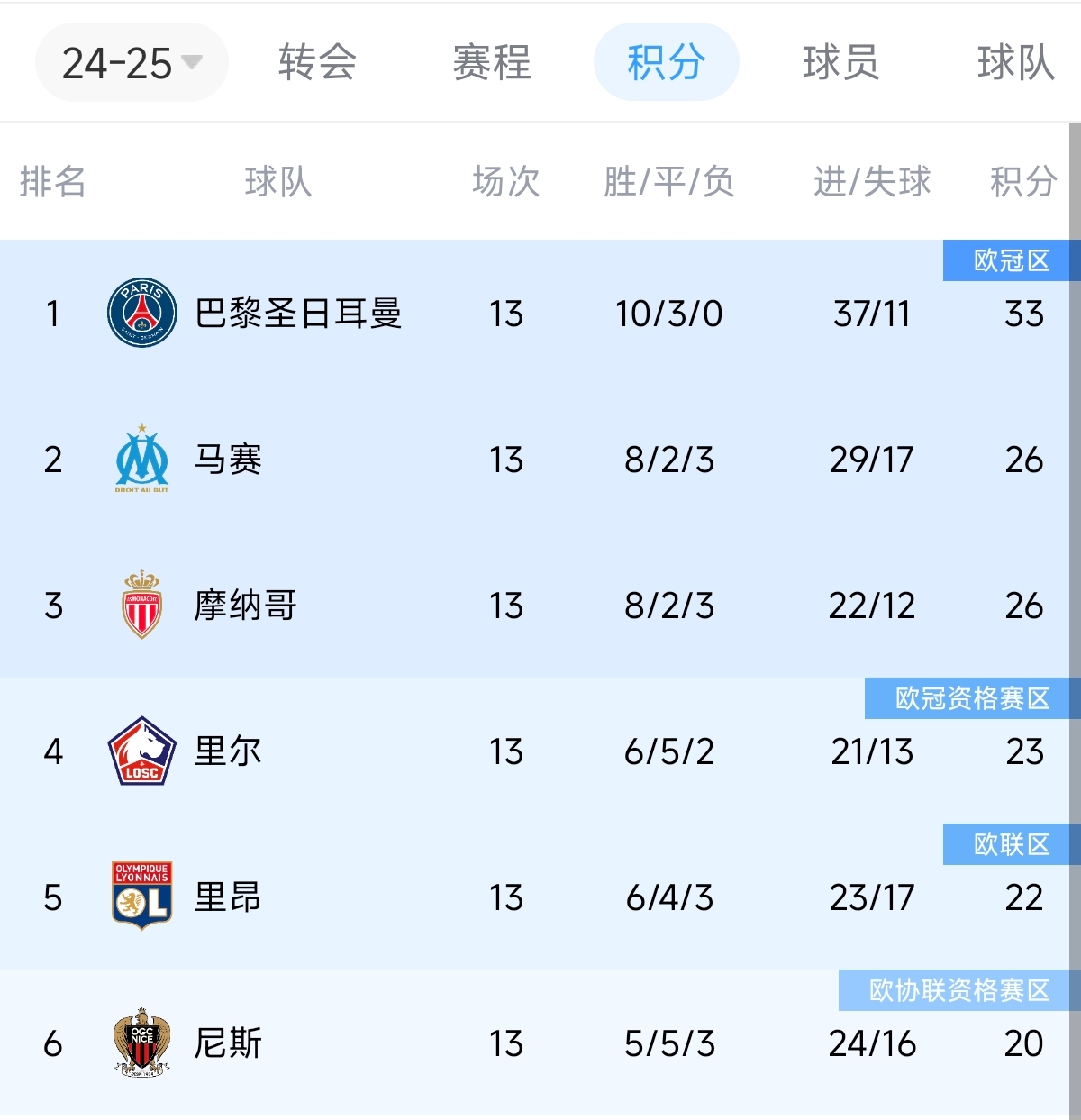 法甲13輪:巴黎33分 馬賽26分