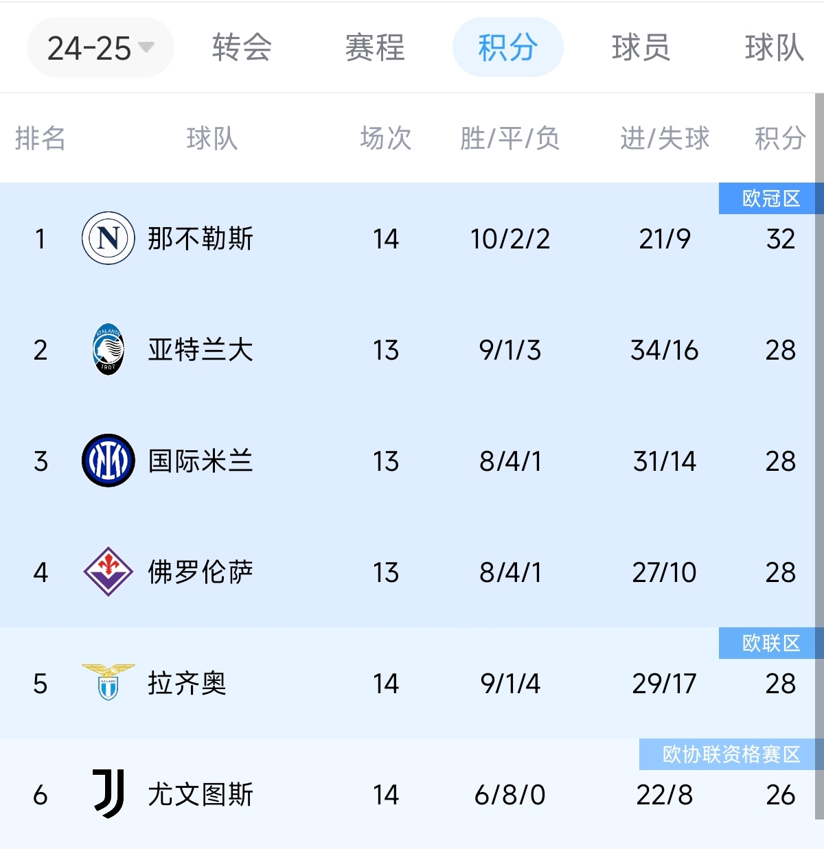 意甲14輪:那不勒斯32分 亞特蘭大等4隊(duì)28分(3隊(duì)少賽1輪)