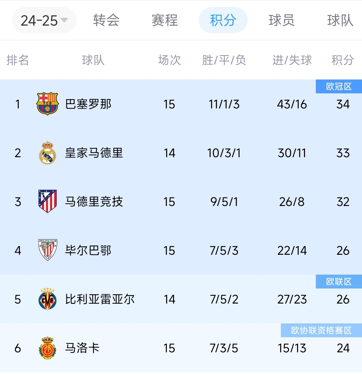 西甲15輪:巴薩34分 皇馬33分(少賽1輪)