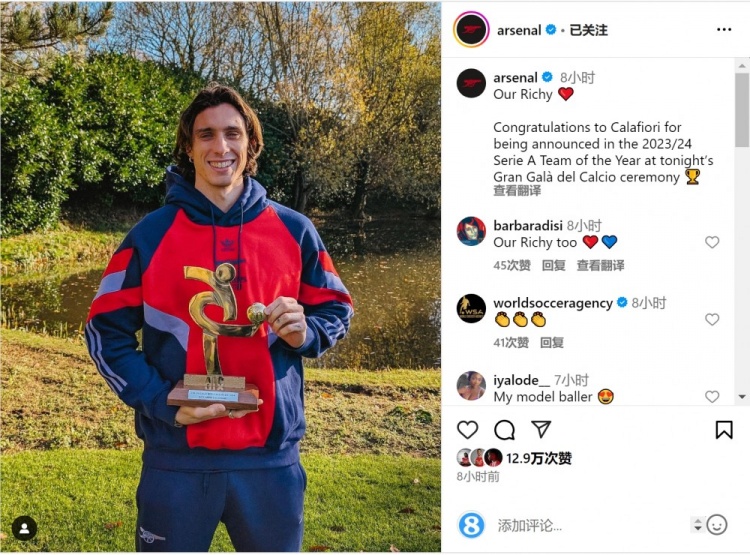 阿森納官方社媒曬出卡拉菲奧里領(lǐng)獎(jiǎng)的照片,并寫(xiě)道:“祝賀卡拉菲奧里入選意大利球員協(xié)會(huì)2023-2024賽季意甲最佳陣容?!?/p>