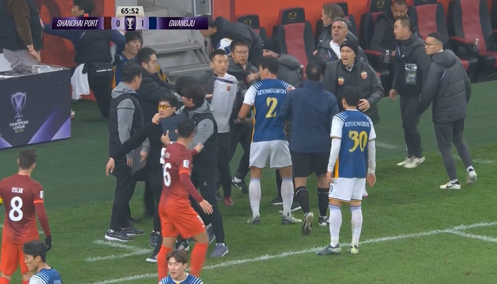 12月03日訊 亞冠精英聯(lián)賽東亞區(qū)第6輪,上海海港vs光州FC,比賽第66分鐘,茹薩將對手直接推出場外,雙方教練組爆發(fā)沖突。