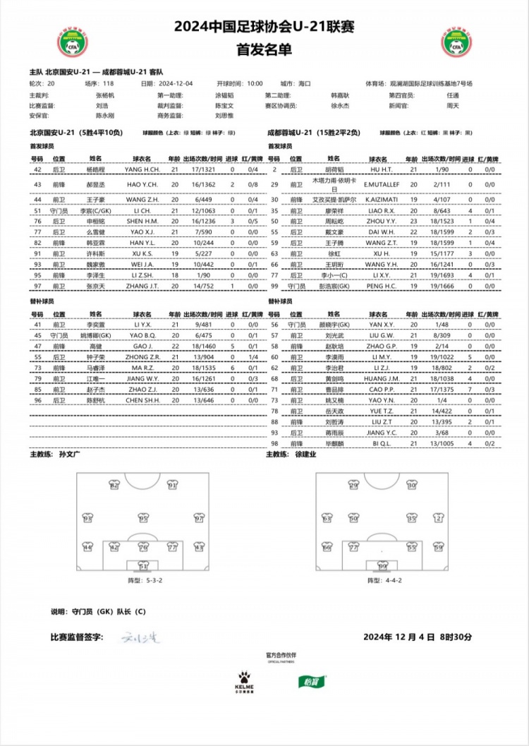 12月4日訊 U-21聯(lián)賽已進(jìn)行至決賽第五階段的關(guān)鍵期,第20輪比賽中,成都蓉城U21將與北京國(guó)安U21展開(kāi)較量。賽前公布的出場(chǎng)名單中,國(guó)腳胡荷韜的名字赫然在列。