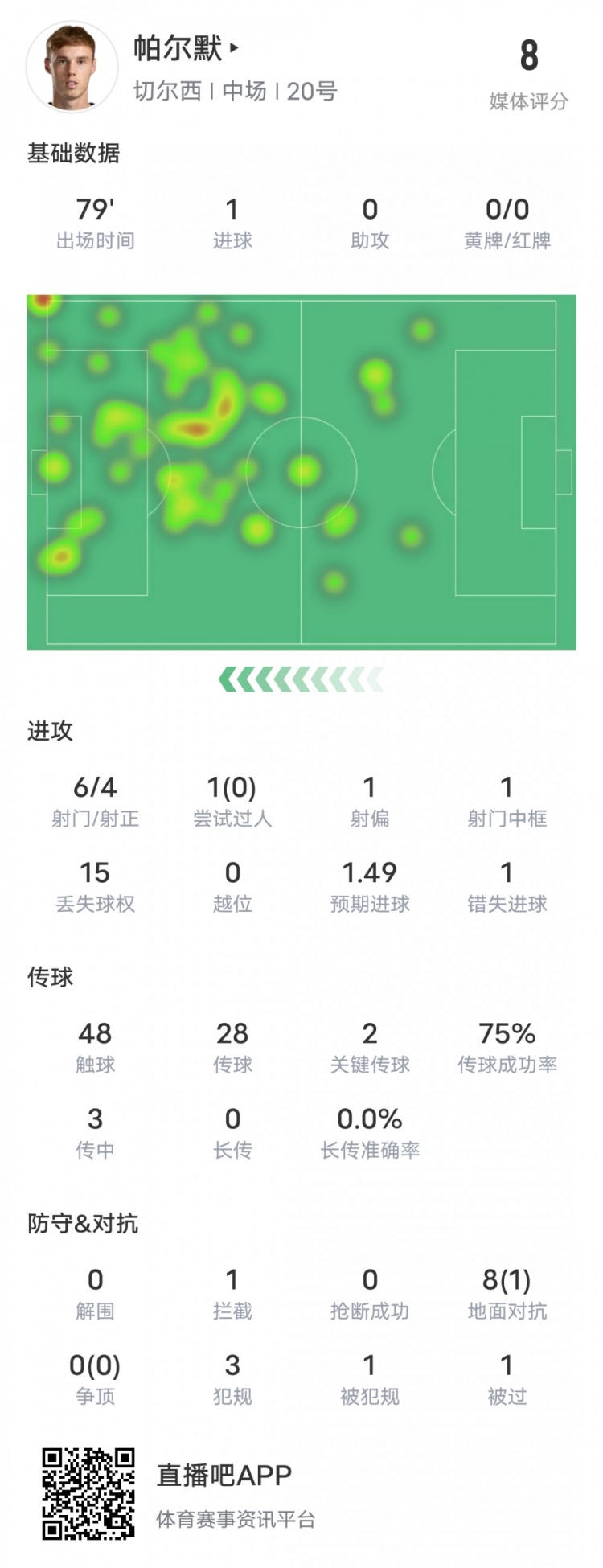 帕爾默本場(chǎng)比賽數(shù)據(jù)如下: