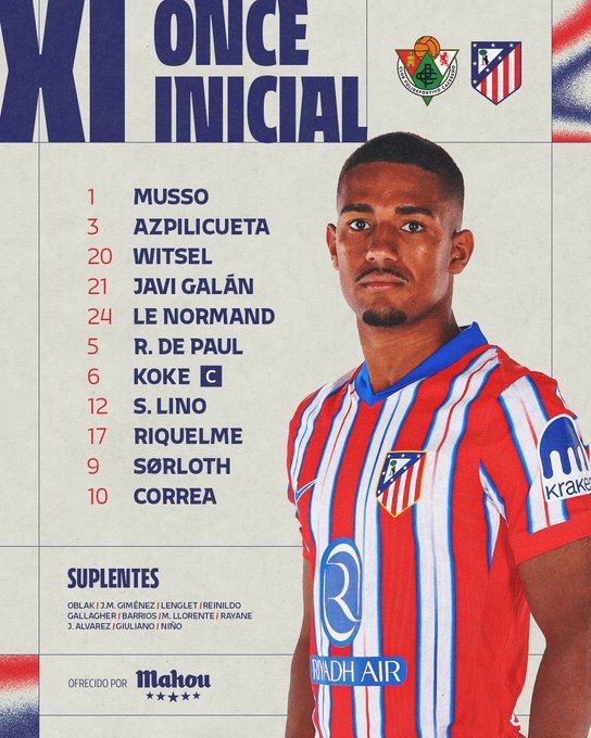 馬競首發(fā):1-穆索、3-阿斯皮利奎塔、20-維特塞爾、21-哈維-加蘭、24-勒諾曼德、5-德保羅、6-科克、12-利諾、17-里克爾梅、9-索爾洛特、10-科雷亞