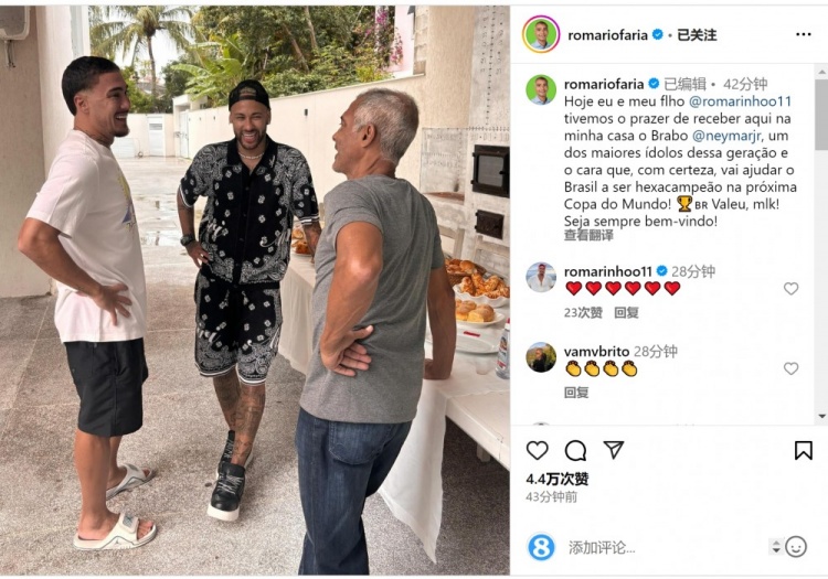 羅馬里奧在社交媒體上寫道:“今天我與我的兒子有幸在家里接待了內(nèi)馬爾,他是這一代球員中最杰出的偶像之一,一定會幫助巴西在下屆世界杯中第6次奪冠!謝謝你,孩子,隨時(shí)歡迎你!”
