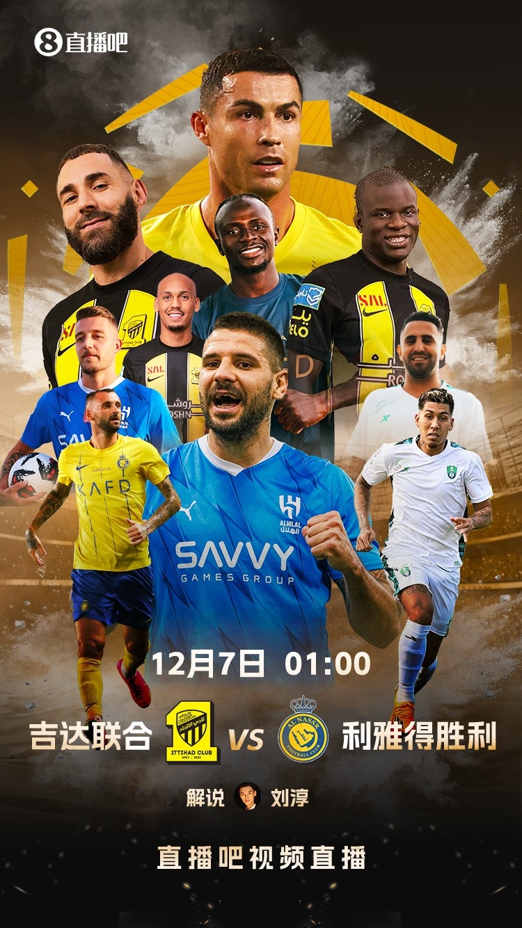 12月6日訊 北京時(shí)間12月7日凌晨1點(diǎn),沙特聯(lián)賽第13輪吉達(dá)聯(lián)合主場(chǎng)對(duì)陣?yán)诺脛倮?,將為吧友們帶?lái)本場(chǎng)比賽的視頻直播,劉淳將擔(dān)任解說(shuō)。