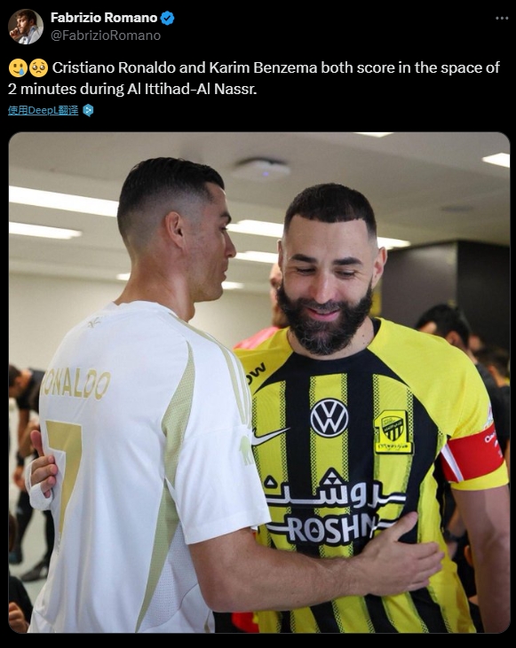 12月07日訊 沙特聯(lián)吉達(dá)聯(lián)合vs利雅得勝利,比賽第55分鐘和第57分鐘,本澤馬和C羅分別取得進(jìn)球。