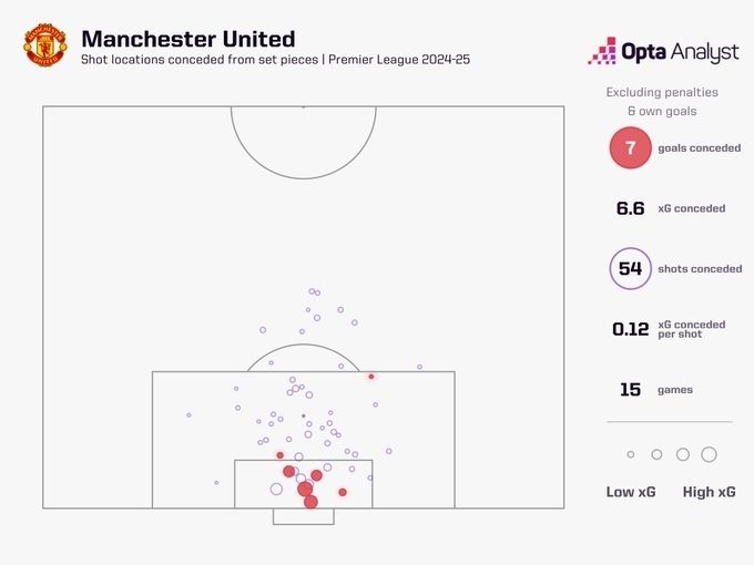 數(shù)據(jù)顯示,曼聯(lián)本賽季在英超聯(lián)賽中已經(jīng)在定位球失球7次,這些定位球失球占到球隊總失球數(shù)的50%,是聯(lián)賽中定位球失球占比最高的球隊。在定位球失球的絕對數(shù)量上,只有狼隊(11個)和南安普頓(8個)的表現(xiàn)比曼聯(lián)更差。