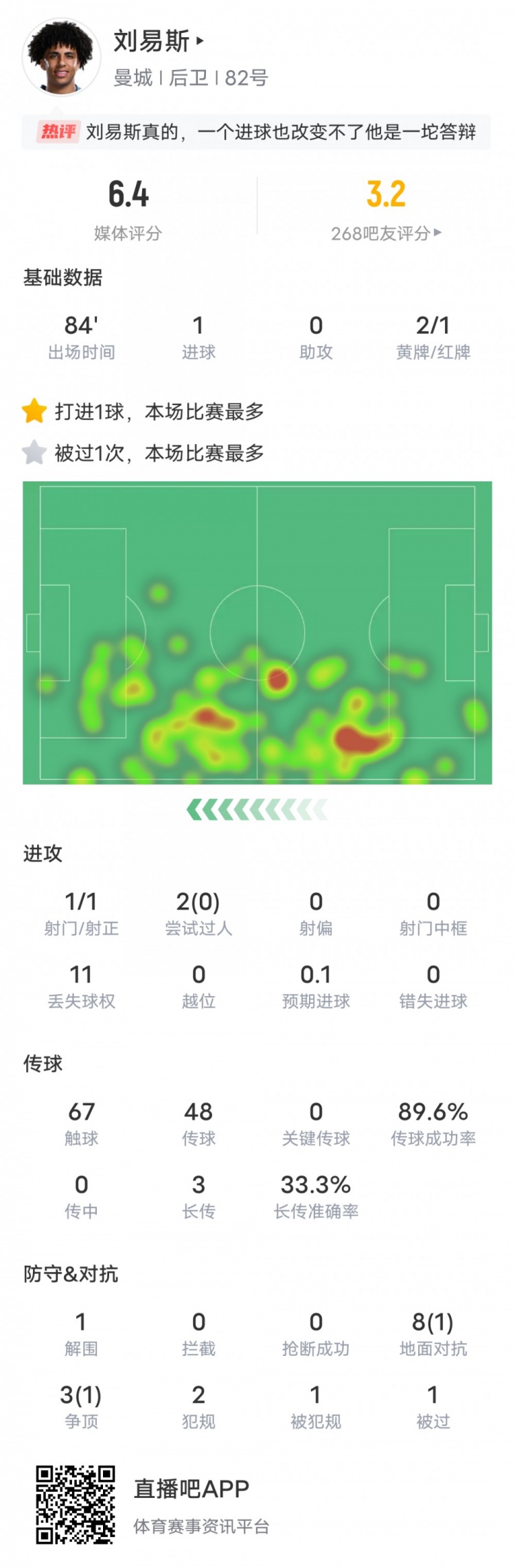 12月8日訊 英超第15輪,曼城客場(chǎng)2-2水晶宮。劉易斯首發(fā)出戰(zhàn),為曼城貢獻(xiàn)1粒進(jìn)球,但兩黃變一紅被罰下,評(píng)分6.4。