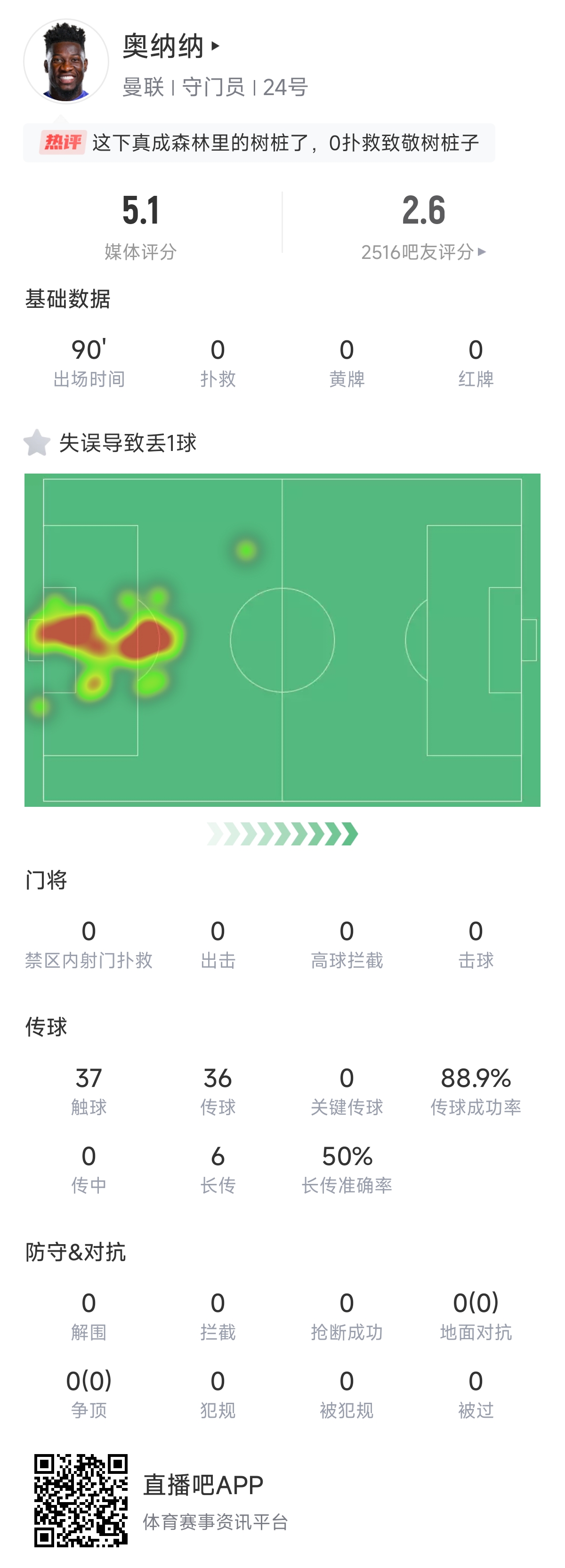 森林隊(duì)全場比賽11腳打門僅有3次射正,但是球隊(duì)取得了3粒進(jìn)球。奧納納整場沒有做出撲救,未能幫助球隊(duì)零封或是少丟球。