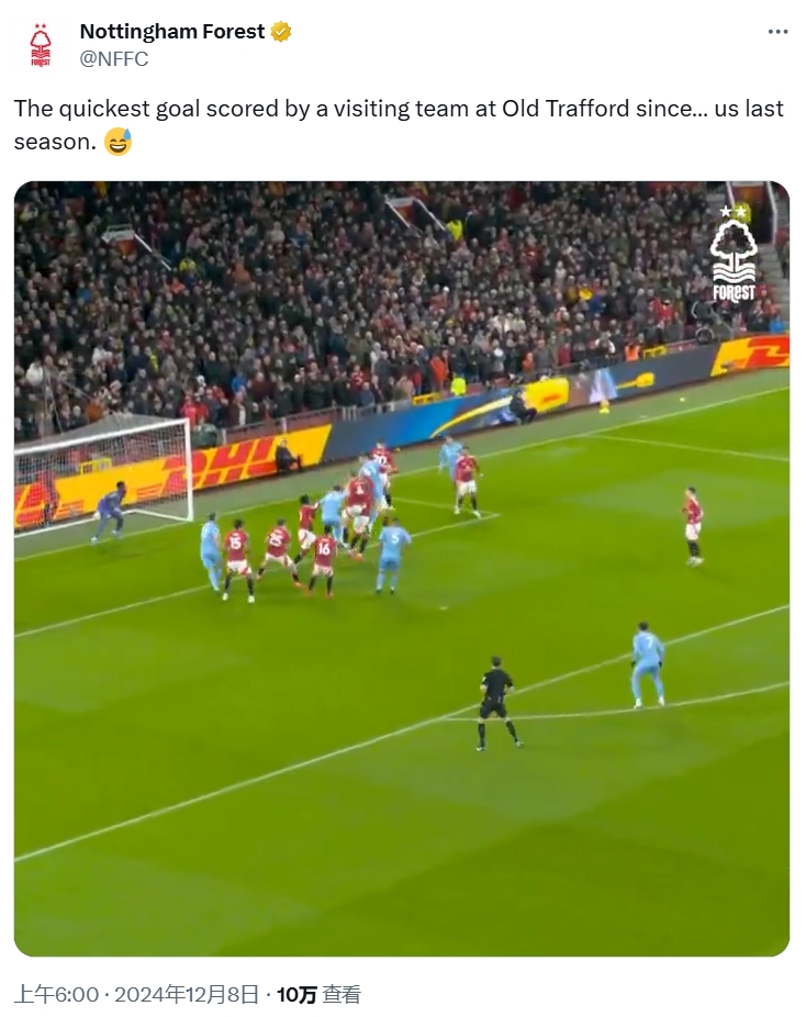 進(jìn)球后,森林官方社媒動(dòng)態(tài)寫道:“客隊(duì)在老特拉福德打進(jìn)的最快進(jìn)球……自上賽季的我們以來?!?/p>