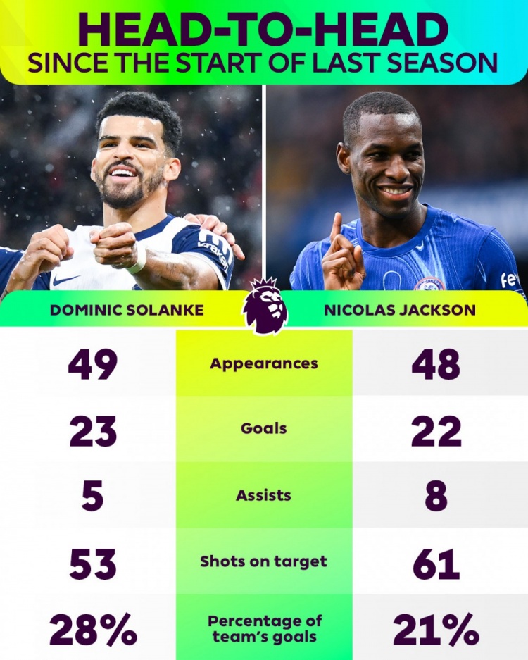 12月8日訊 北京時間明天凌晨,熱刺將在英超第15輪比賽中主場對陣切爾西。英超官方統(tǒng)計了兩隊中鋒索蘭克、杰克遜上賽季至今的聯(lián)賽數(shù)據(jù),并作出對比。