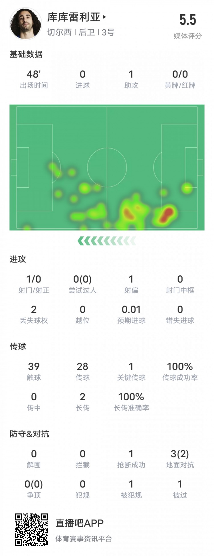 庫(kù)庫(kù)雷利亞半場(chǎng)數(shù)據(jù):