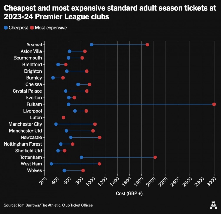 (圖片說明)23/24賽季各俱樂部英超成人票價(jià)(藍(lán)點(diǎn)為最低檔票價(jià);紅點(diǎn)為最高檔票價(jià))