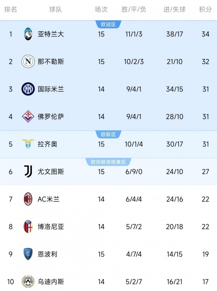 據(jù)Opta統(tǒng)計(jì),意甲前15輪比賽拿到34分,這是亞特蘭大隊(duì)史意甲同期最高積分。