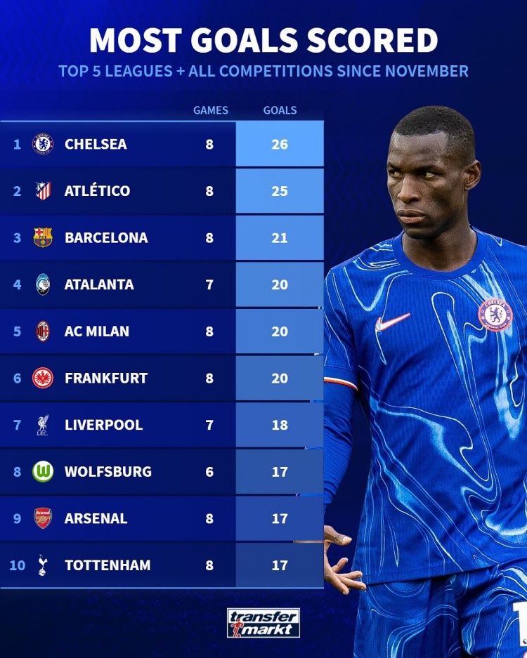 12月9日訊 德國轉(zhuǎn)會市場統(tǒng)計(jì)了五大聯(lián)賽球隊(duì)11月以來的進(jìn)球數(shù)量,并列出榜單,切爾西26球居首,馬競25球次席、巴薩21球第三。