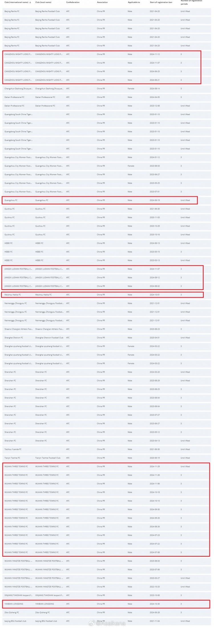 在12月9日例行更新的國(guó)際足聯(lián)注冊(cè)禁令披露系統(tǒng)中,目前還存在轉(zhuǎn)會(huì)注冊(cè)禁令的俱樂(lè)部包括滄州雄獅(4條)、廣州(1條)、江西廬山(3條)、梅州客家(1條)、武漢三鎮(zhèn)(11條)、延邊龍鼎(1條)。 ???對(duì)比上周,延邊龍鼎減少了1條,其他沒(méi)有變化。 ???